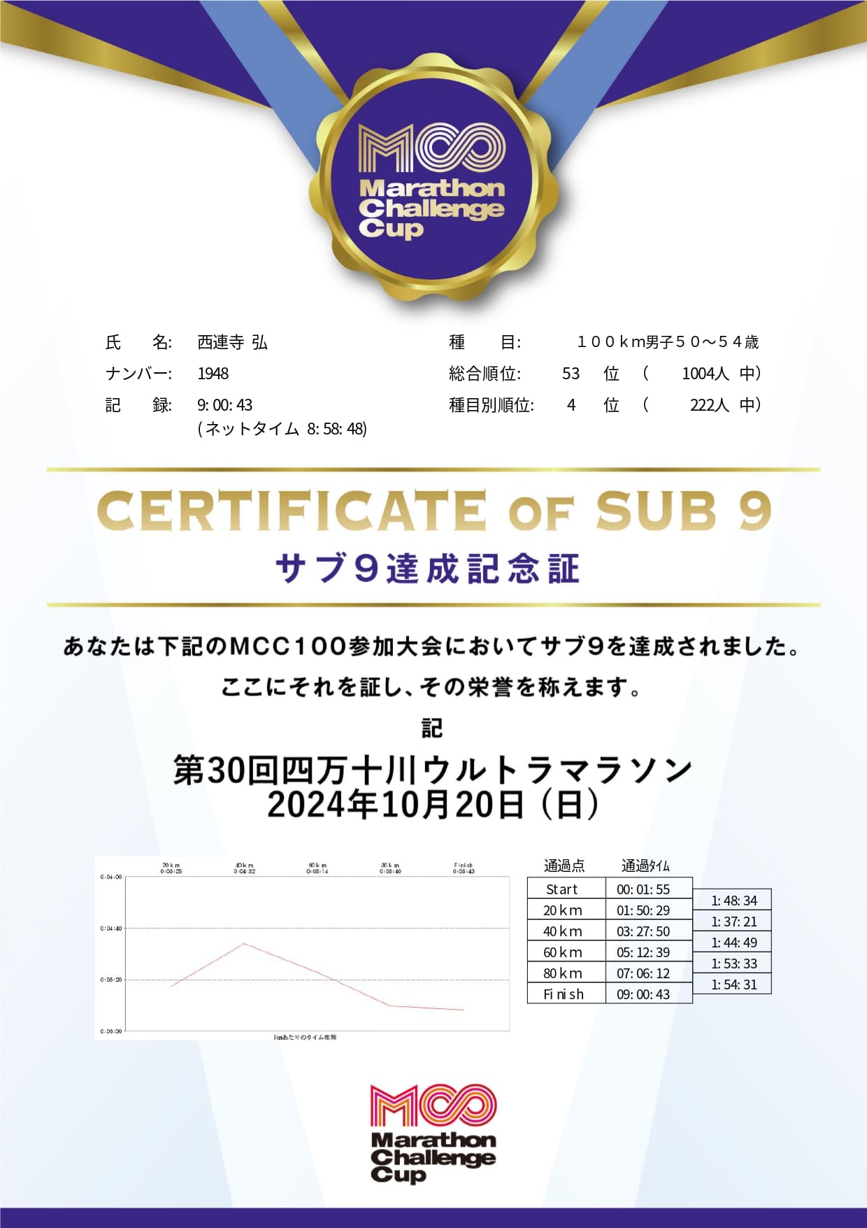 3年連続『年間グランドスラム』達成。ウルトラ4大大会を制覇する幻の称号『ウルトラ・マエストロ』達成。現在『ワールドメジャーズ』に挑戦中。フルベスト 2:44:00(51歳時)。https://konishi-office.com/